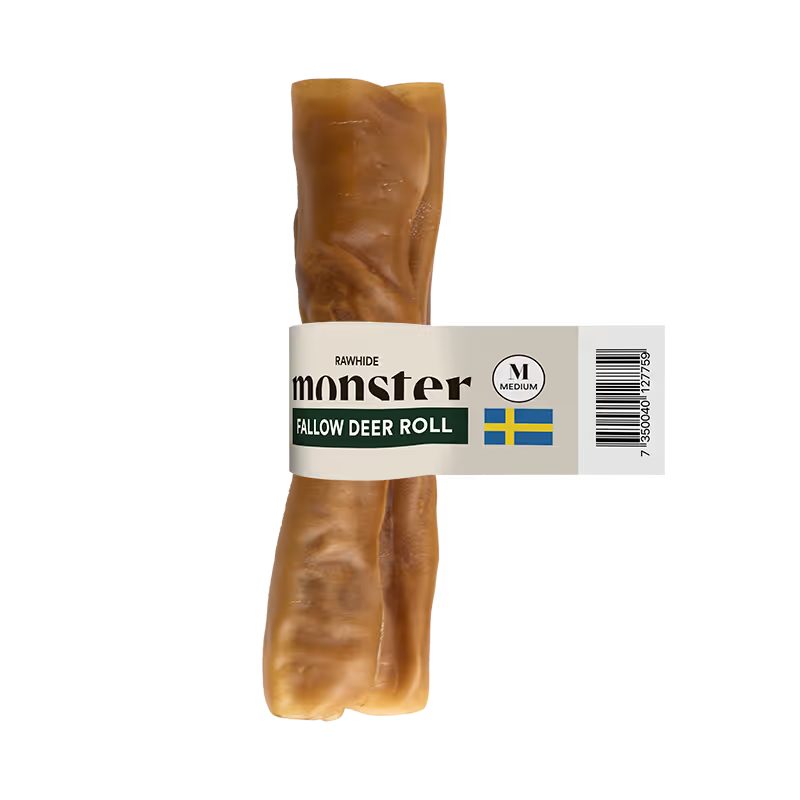 Monster Rawhide Fallow Deer Roll är ett naturligt tuggben tillverkat av 100 % svensk råhud av dovhjort. Varje tuggben är varsamt handgjort i Sverige och rullat för hand till en tät och hållbar form som ger en lång och tillfredsställande tuggtid.