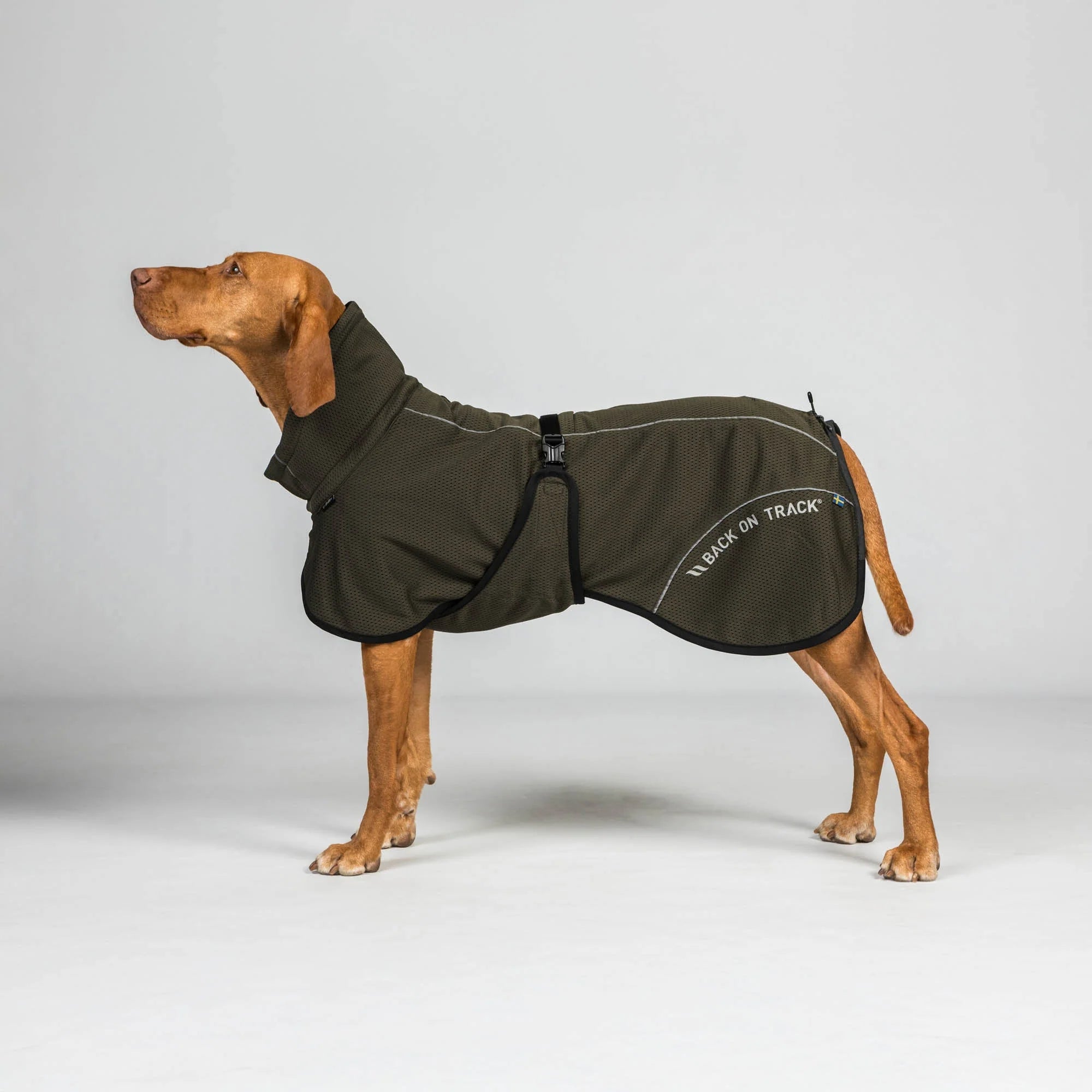 Täcket har en omslutande, kroppsnära passform som följer hundens linjer utan att hindra rörelse. Den omlottade fronten ger utrymme för frambenens naturliga rörelser, och med dragskon ovanför svansroten kan rygglängden justeras för optimal passform.